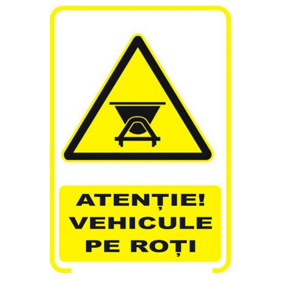 Semne si indicatoare / Placute de avertizare / Placuta indicatoare de securitate de avertizare, atentie, vehicule pe roti, Onsec, 200x300 mm, PVC, 3 mm